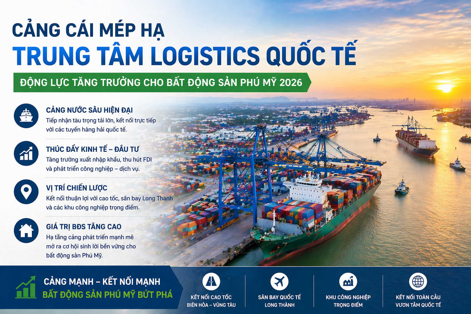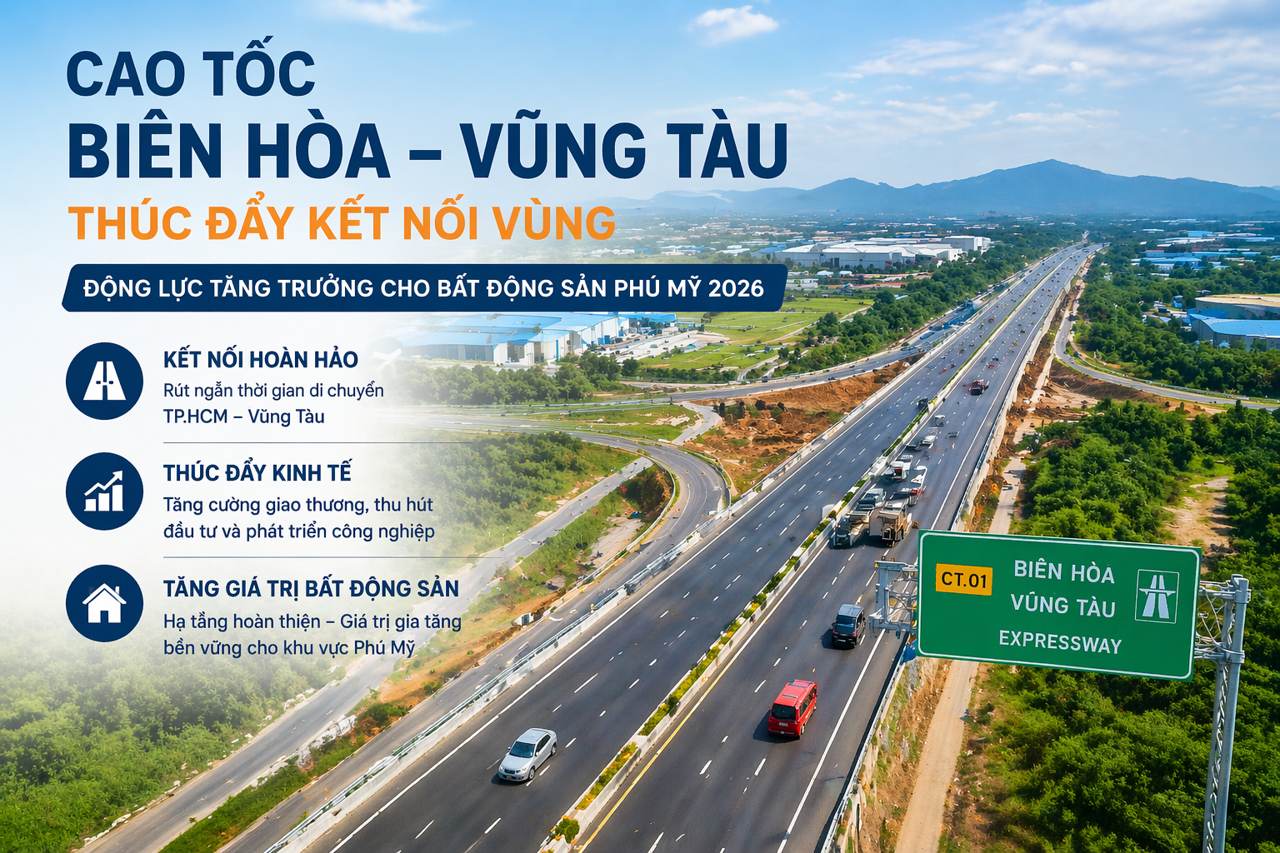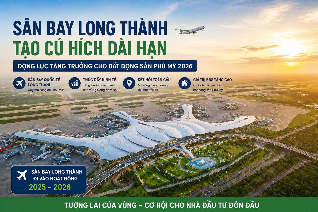 Năm 2026 được xem là bước ngoặt của thị trường bất động sản Phú Mỹ 2026 khi hàng loạt dự án hạ tầng trọng điểm đồng loạt về đích. Từ cao tốc Biên Hòa – Vũng Tàu đến sân bay Long Thành và siêu cảng Cái Mép Hạ, tất cả đang tạo nên một “tam giác tăng trưởng” giúp khu vực này trở thành điểm đến đầu tư hàng đầu phía Nam.