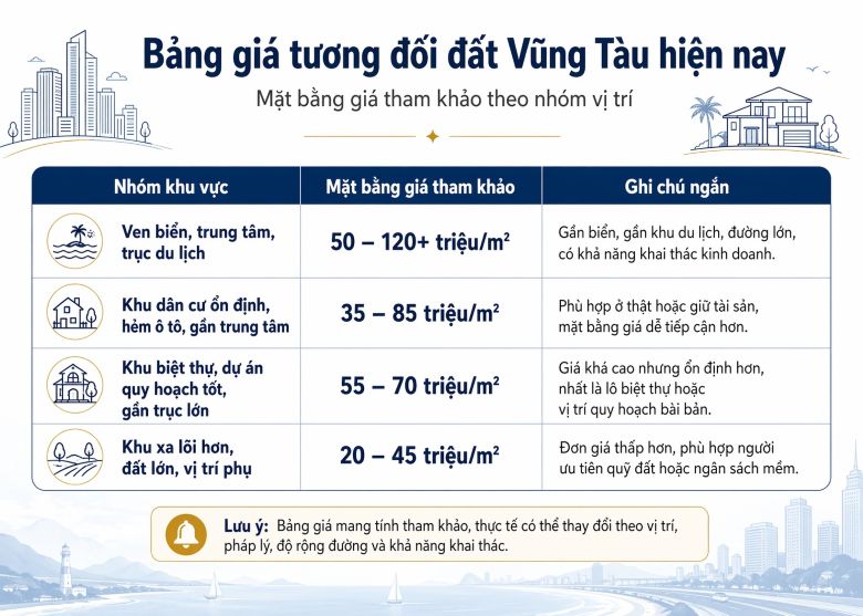 Để nhìn dễ hơn, có thể chia mặt bằng giá đất Vũng Tàu thành bốn nhóm lớn. Cách chia này không phải để chốt cứng một con số, mà để người đọc hiểu vì sao giá chênh lệch và vì sao không nên nhìn Vũng Tàu bằng một mặt bằng duy nhất.